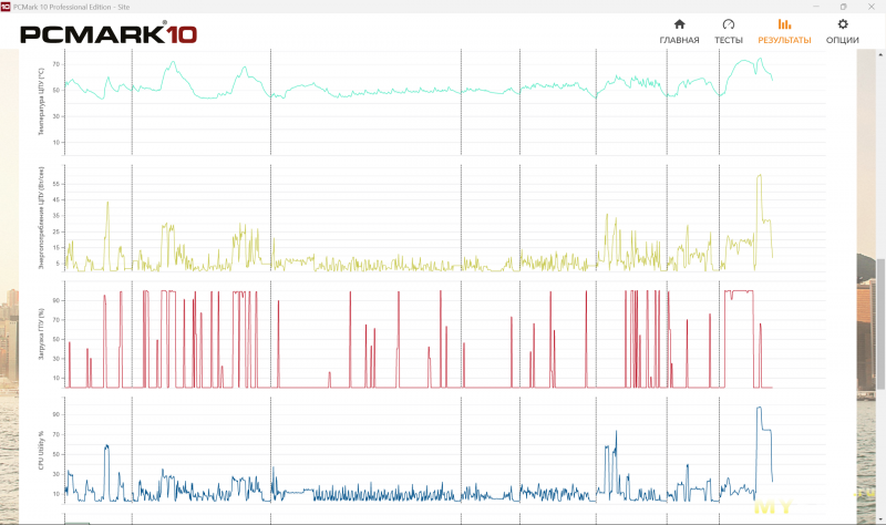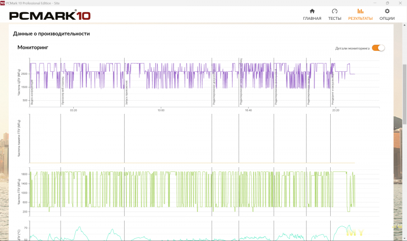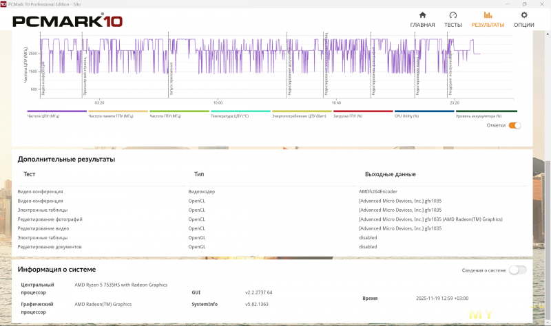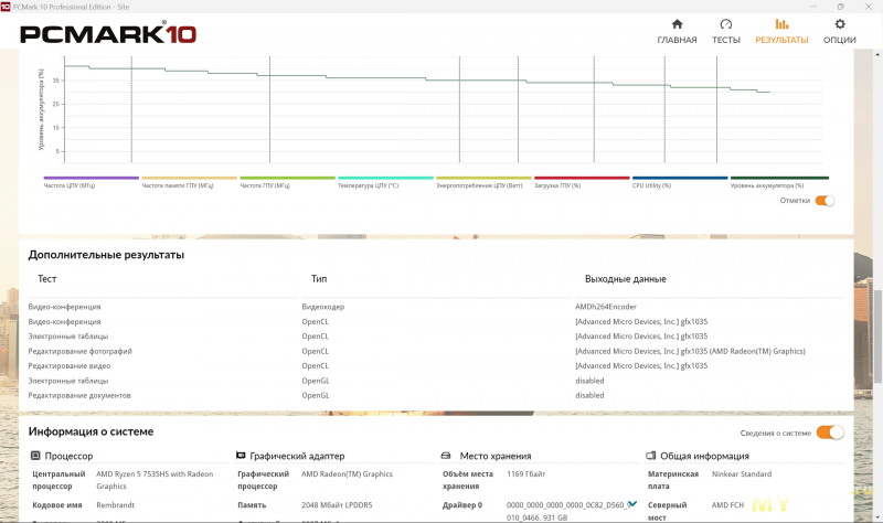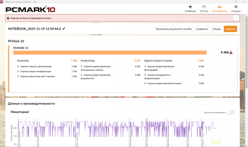 Комплексный тест PCMARK10 оценил ноутбук в 4264 балла. Просадку итогового балла вызвала низкая оценка редактирования видео. Температура процессора при тестировании не превышала 80 градусов.