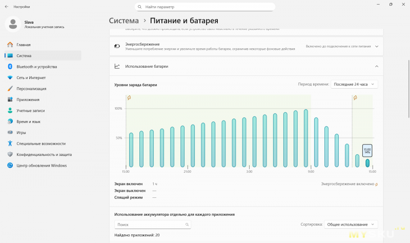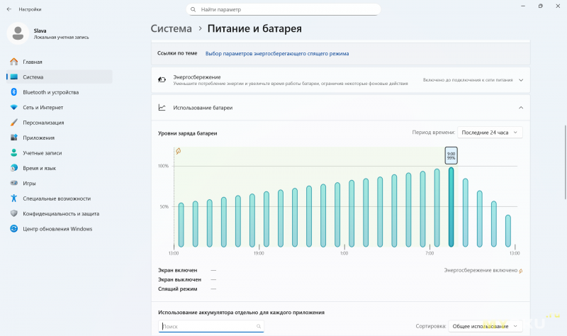Время автономной работы порадовало. В режиме тестирования аппаратной составляющей, а это один из самых тяжёлых для компьютера режимов работы, ноутбук протянул почти 7 часов, включив режим энергосбережения на 5 часу работы и без предупреждения отключившись на 5% заряда аккумулятора.