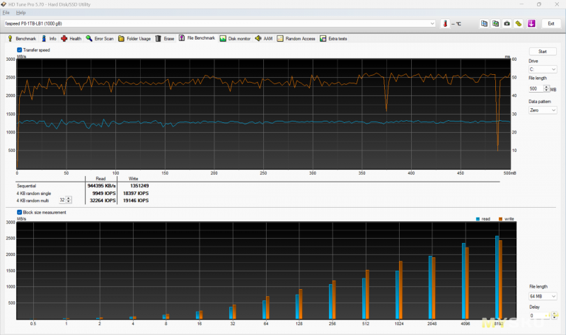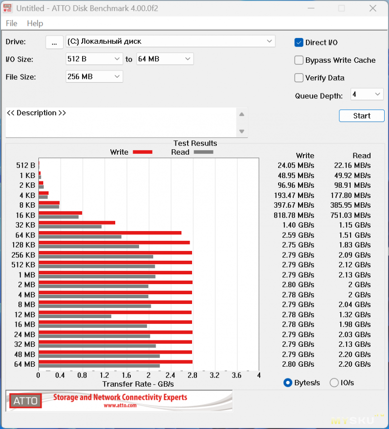 Более подробно тестирование блоками разного размера можно увидеть в программе ATTO Disk Benchmark. На пик скоростных характеристик диск выходит на блоках размером от 256 кБ и далее скорость чтения/записи практически не снижается с единственным провалом по скорости записи на блоке 12 МБ.