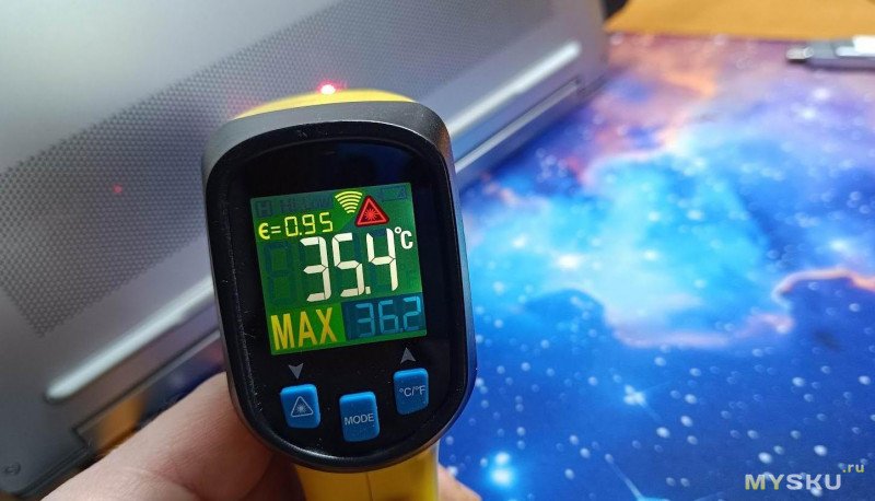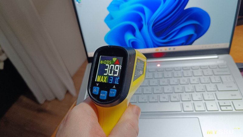 При обычной работе корпус ноутбука почти не греется. Температура передней панели в районе процессора не превышает 31°C. Сзади в районе выдува горячего воздуха из корпуса температура составляет 36-37°C.