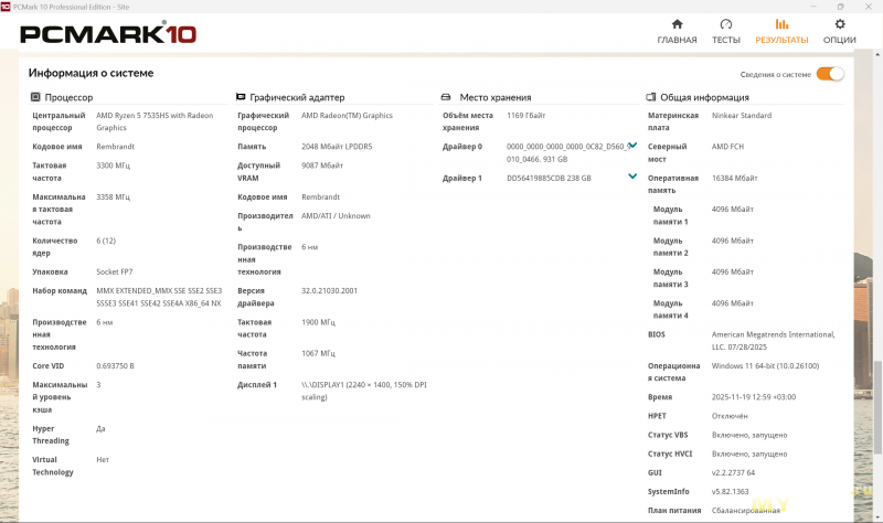 Процессор — Ryzen 5 7535HS. Это специализированный ноутбучный процессор на архитектуре Rembrandt-R. Он имеет 6 ядер/12 потоков и изготовлен по 6 нм техпроцессу, максимальная частота составляет 4550 МГц, множитель заблокирован.