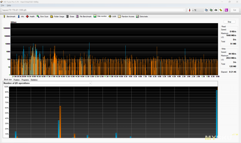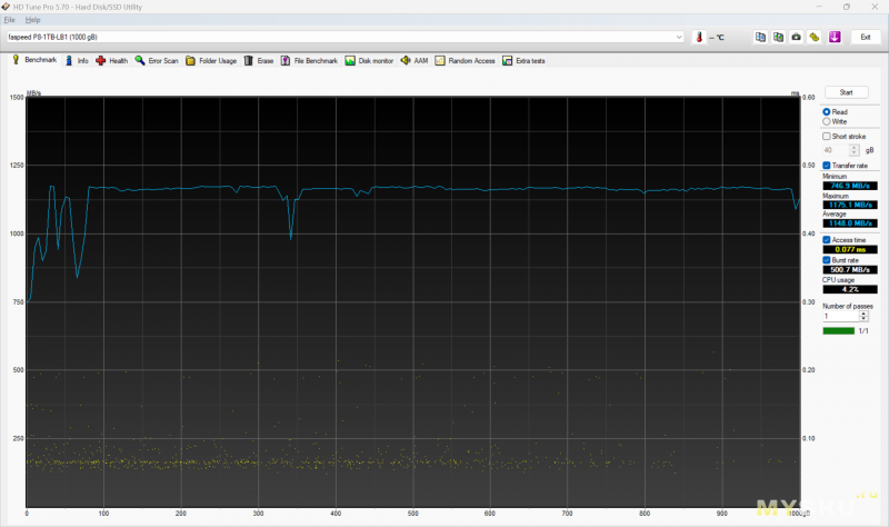 Результаты тестирования SSD диска в различных режимах специализированной программы HD Tune можно увидеть на скриншотах ниже.