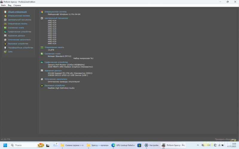 Основные сведения о программно-аппаратной начинке ноутбука представлены на скриншоте ниже. Операционная система — лицензионная Windows 11 pro 64-бит.