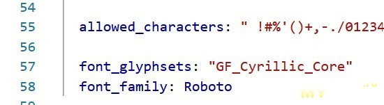 Также для нормального отображения кириллических символов нужно будет поменять шрифтыfont_glyphsets: «GF_Cyrillic_Core»