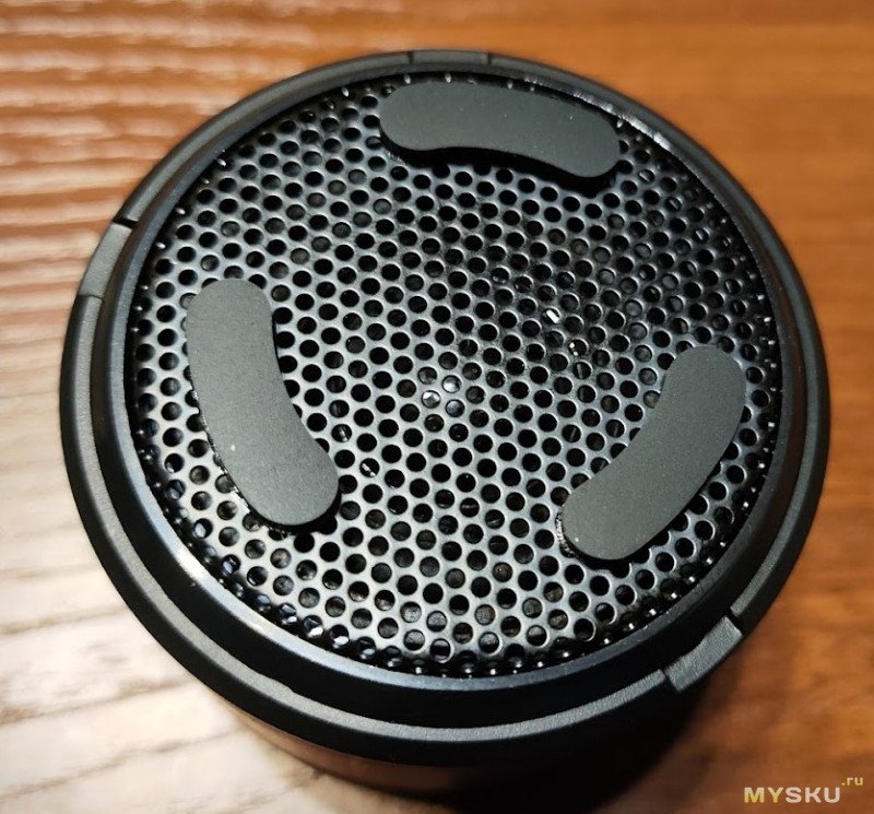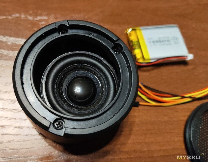 Аккумулятор на 1000mAh и почему он не внутри колонки — сие тайна великая есть. Может, какие-то приколы с таможней, может есть варианты комплектации без аккумулятора. Не знаю.При встряхивании колонки выяснилось, что внутри что-то активно болтается. Снимаем решётку на дне(сколупывается ногтем)