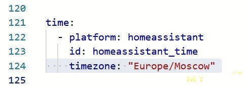 Также в ямл нужно будет внести несколько изменений. Во первых, если ваш экземпляр ESPHome работает в докере — надо прибить гвоздями правильную таймзону(т.е. в блоке time добавить timezone: «Europe/Moscow»(для Москвы, очевидно)