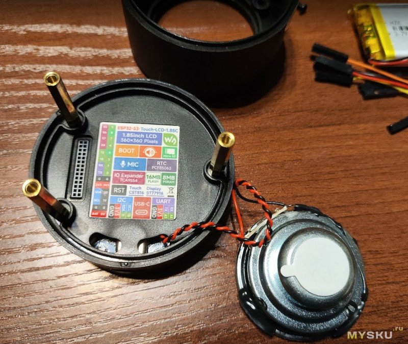 И понимаем, что динамик должен был держаться на трёх каплях термосоплей, а верхняя часть колонки — это вполне себе отдельный модуль, который можно использовать самостоятельно. Даже распиновка красиво оформлена и наклеена — ребята явно вдохновлялись продукцией M5 Stack.