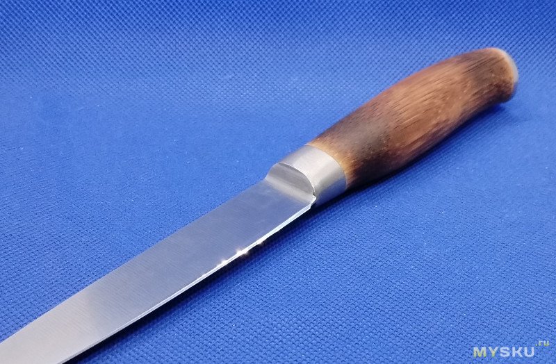 Если честно, то я не в восторге я от Самуры. Ну какая там Japan, зачем это писать на клинке. Я даже не уверен в наличии AUS8. Но нож режет геометрией, а с этим у Самуры все в порядке: толщина клинка, ширина, спуски от обуха, сведение. И термообработка действительно присутствует вне зависимости от используемой стали.