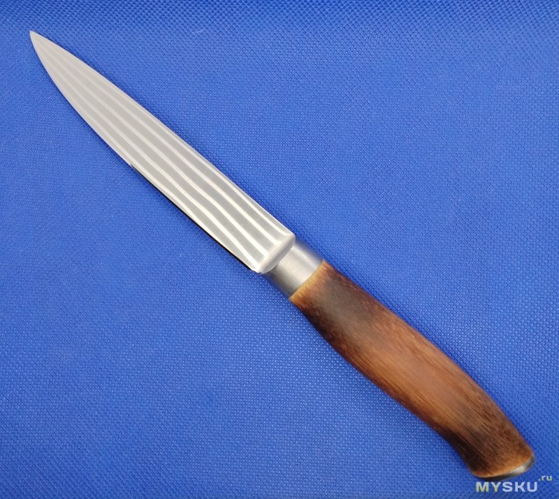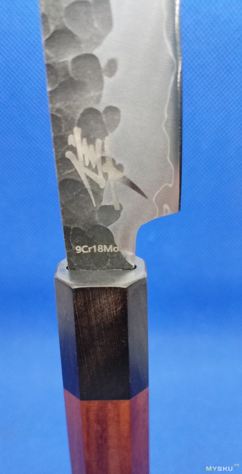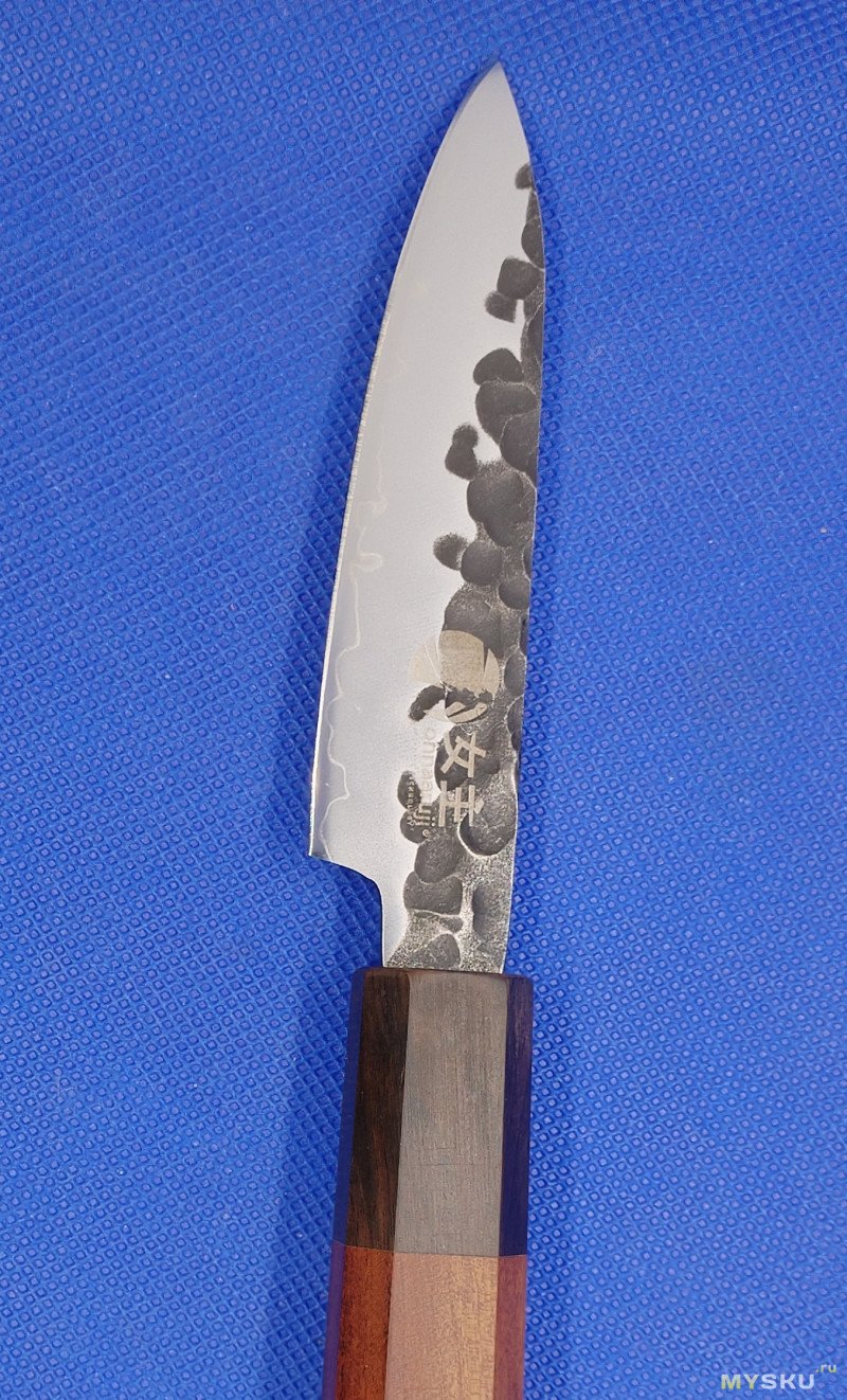Сталь понравилась, похожая на Самуру. Термообработка в анонсированном диапазоне чувствуется 56-58 HRC (заявлено 56+ HRC), что на кухне для такого типа и исполнения совсем неплохо.