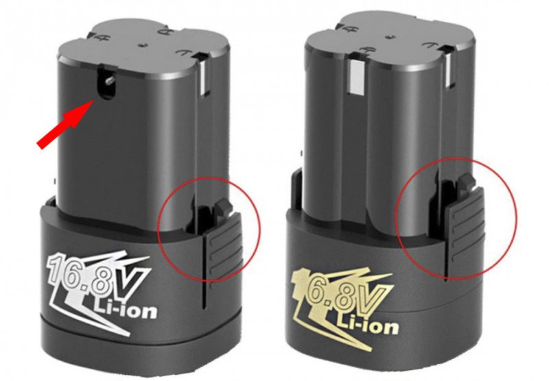 В новом аккумуляторе имеется гнездо для зарядки 3,5 мм. ( на фото указано красной стрелкой).