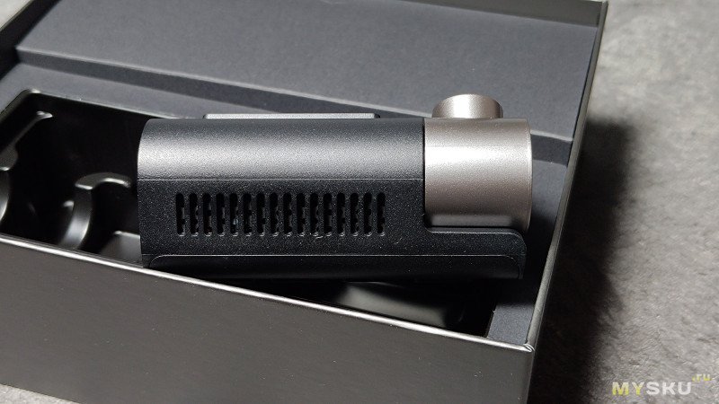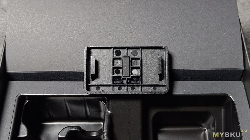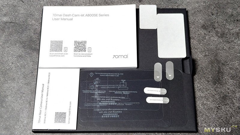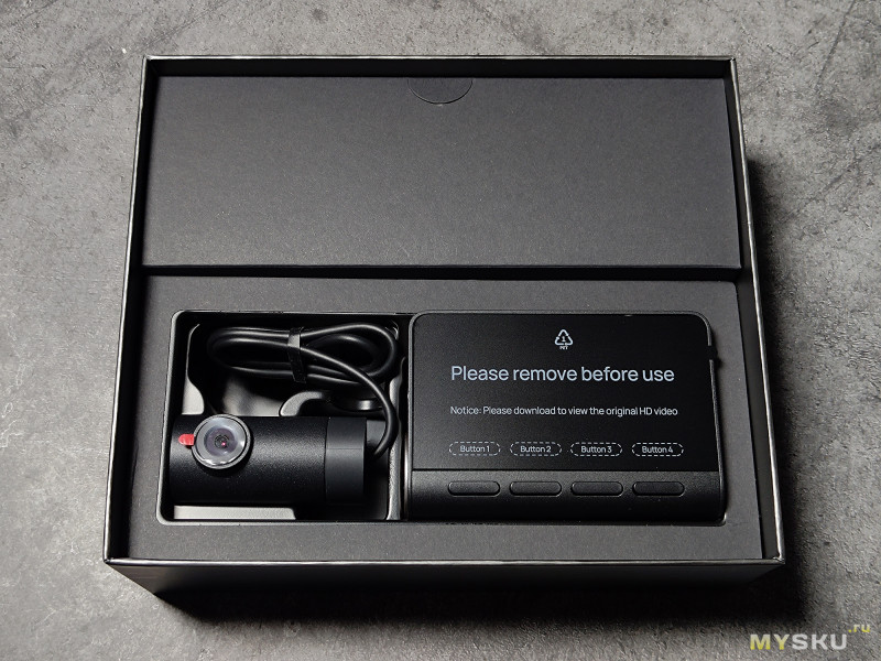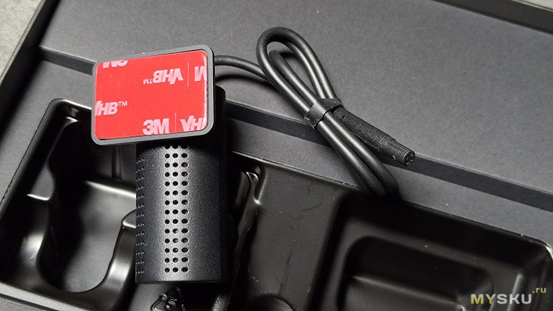 Внутри основной коробки находится регистратор со второй камерой, уложенные в ложемент, крепёжные элементы, провода, адаптер питания, стикеры и инструкция.