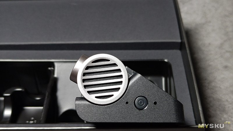 На фронтальной стороне пазы для крепления на держатель и справа поворотный блок c камерой, которую можно отрегулировать по вертикали. Параметры камеры: сенсор GalaxyCore GC8613 (8 MП), 2G4P, диафрагма: F1.55, разрешение Ultra HD 4K (3840 х 2160), 30 FPS HDR, угол обзора:140°