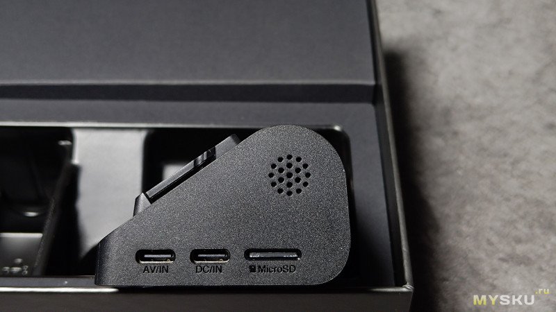 На корпусе камеры не пазы, а просто площадка с клеящим слом. Соединение с регистратором осуществляется посредством отдельного удлинителя, к которому камера подключается через круглый 4-контактный штекер.