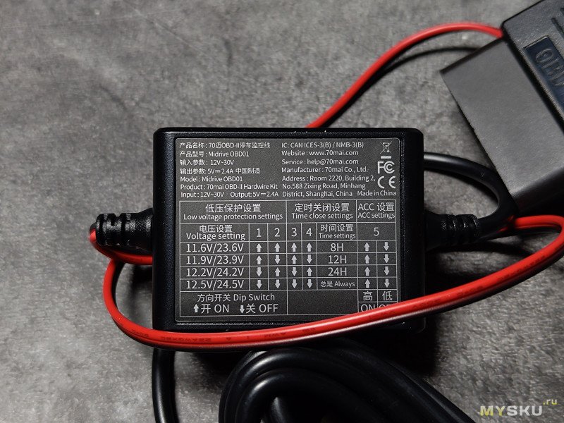 OBD-кит нужен для подключения видеорегистратора к диагностическому разъёму и защиты аккумулятора авто от глубокого разряда путём выставления нижнего порога вольтажа. Он включает специальный блок с переключателями и парковочный провод 70mai Midrive OBD01 с USB-C коннектором, подключаемым к видеорегистратору. Через комбинацию переключателей выставляется требуемое остаточное напряжение и время работы. При правильном подключении после остановки двигателя и активации режима охраны, регистратор перейдёт в режим ожидания и в случае форс-мажора начёт запись.