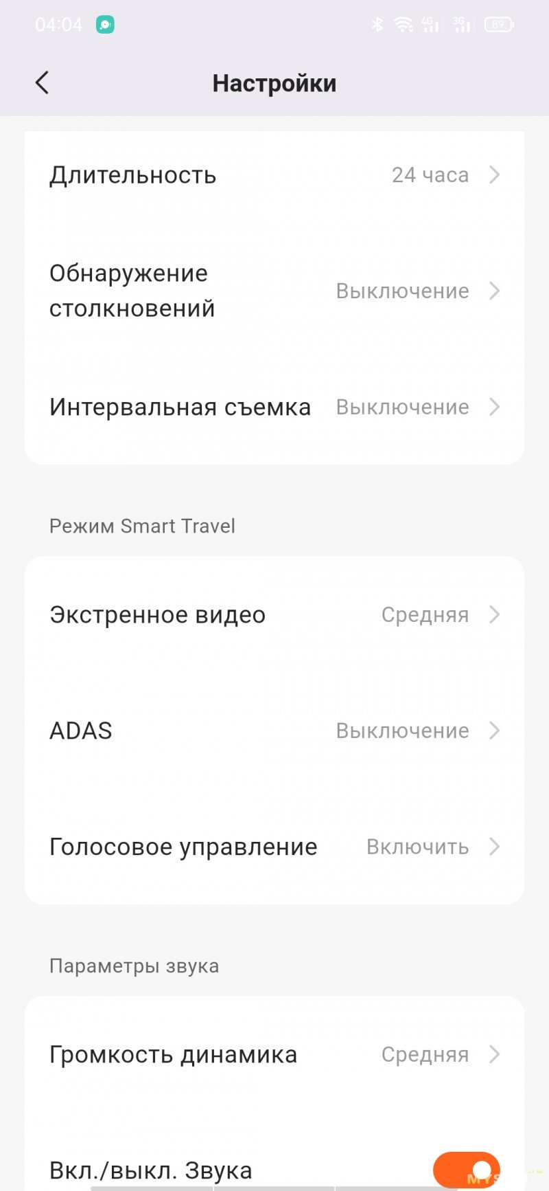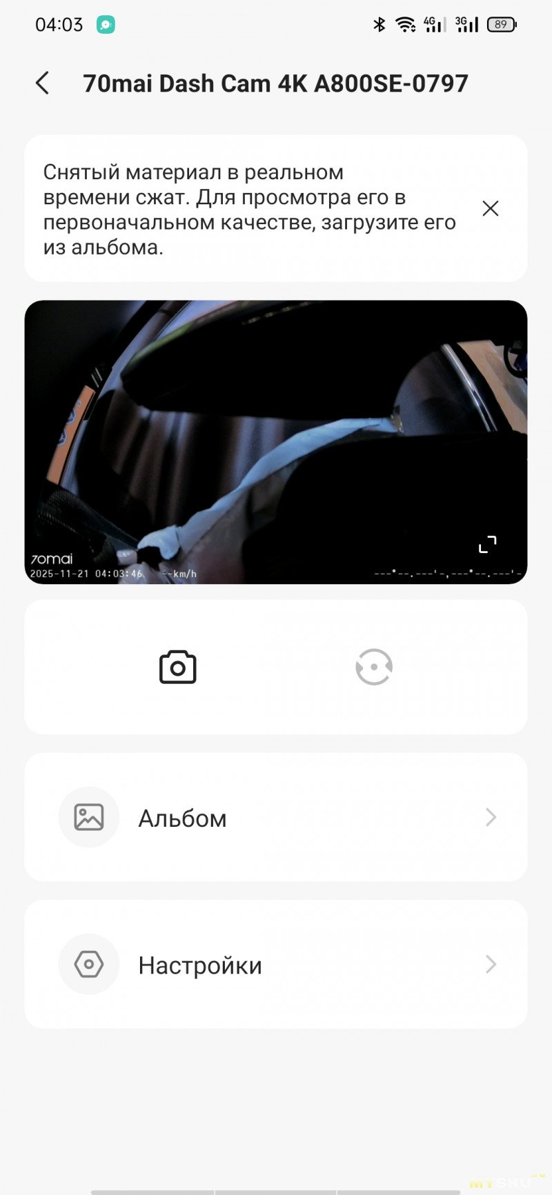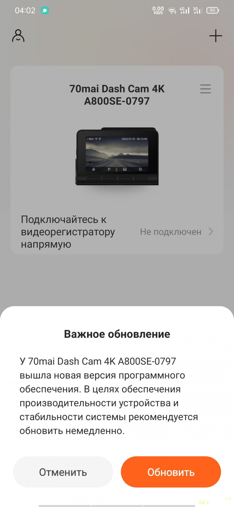 Приложение скачивается с маркета, либо через QR-код с экрана регистратора. Настраивать видеорегистратор с кнопок не так удобно, как через мобильное приложение. Как только на смартфоне появится картинка с камеры, на самом регистраторе экран будет неактивен. При просмотре галереи записей будут подгружаться миниатюры, если нужны ролики в исходном качестве, то их придётся подгружать выборочно. При необходимости можно обновить прошивку на устройстве. Подключение по WiFi, но Bluetooth и геолокация должны быть тоже включены.