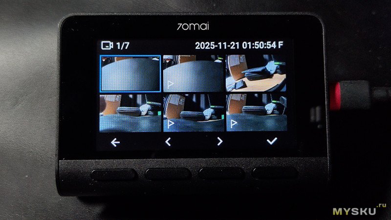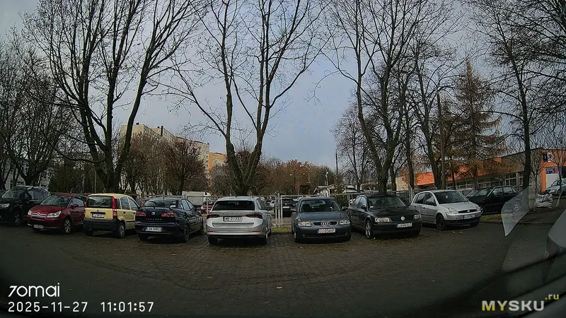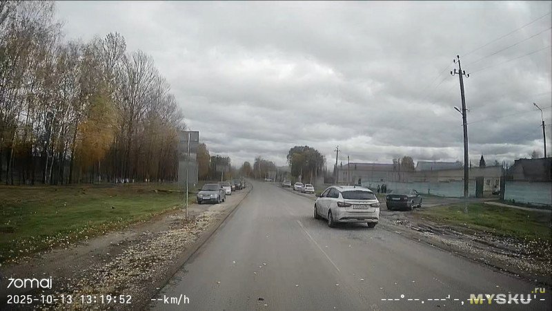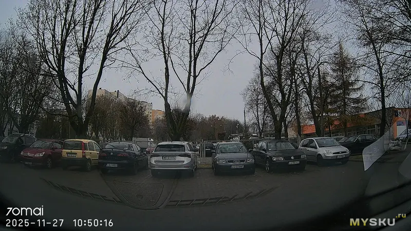 Основная камера снимает более-менее сносно в дневное время на относительно низких скоростях и на расстоянии до 20м номера можно прочитать. Довольно выраженная бочкообразная дисторсия. В ночное время — картинка начинает шуметь, так как повышенное ISO и низкий битрейт, отчего на градиентных переходах можно заметить артефакты сжатия. Но что-то разглядеть ночью всё равно удастся. При езде по трассе на 70км/ч и выше на записях будут смазы. Вообще даже удивился, что сейчас на момент 2025 года 60к/с до сих пор массово пока не завезли в современные регики, ведь они всё равно снимают на коротких выдержках, а память не в дефиците. Вторая камера обладает меньшим разрешением и на высокую детализацию рассчитывать не приходится, плюс дело усугубляется быстрым загрязнением пылью и грязью заднего стекла, особенно в демисезонные периоды. Моё мнение — лучше пусть будет хоть какая-то камера в слепой зоне, чем вообще никакая. Также её можно использовать как парковочную камеру, мониторя картинку с экранчика (менее удобно) или с большого дисплея смартфона (удобнее). Качество записи звука нормальное, речь на записях разборчивая, даже сказанная вполголоса.