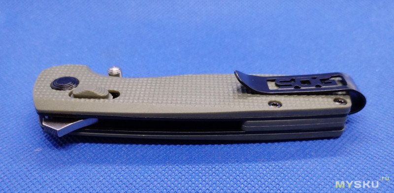 Дальше — лёгкое движение кистью и клинок на фиксаторе. Можно сразу при открывании за флиппер сделать легкое движение кистью в направлении открытия – клинок сразу зафиксируется замком. В открытом состоянии фиксация клинка отличная. Нет даже намека на люфт. Замок тоже держит отлично.