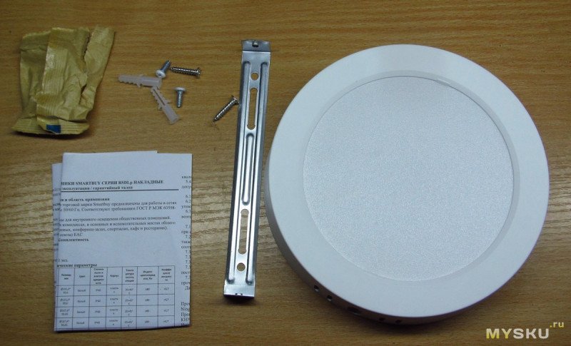 Комплектация: сам светильник, крепежная скоба, инструкция, ну и в бумажном пакетике пара дюбелей с шурупами и пара винтов для крепления светильника к скобе.