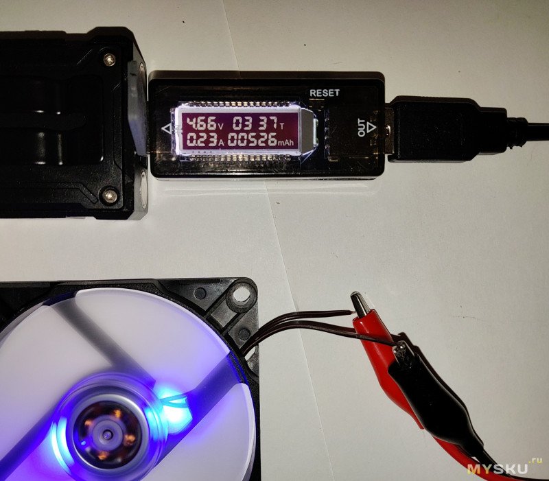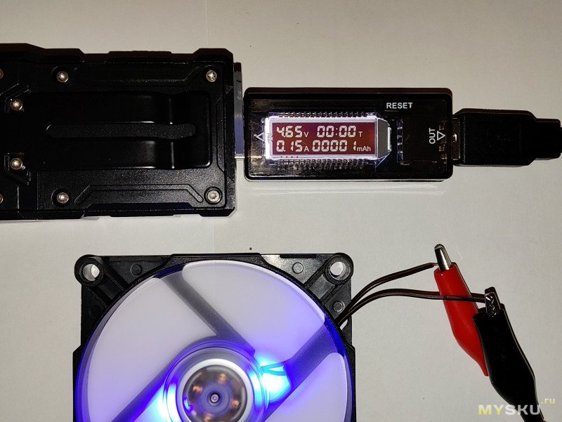 Теперь полностью заряженный фонарь — через тестер подключен к вентилятору 5V, 0.15A: