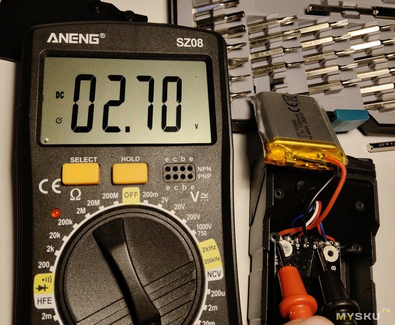 Вначале полностью разряженный фонарик подсоединил через тестер к ЗУ: