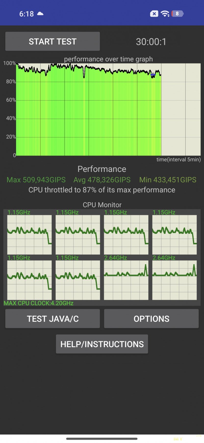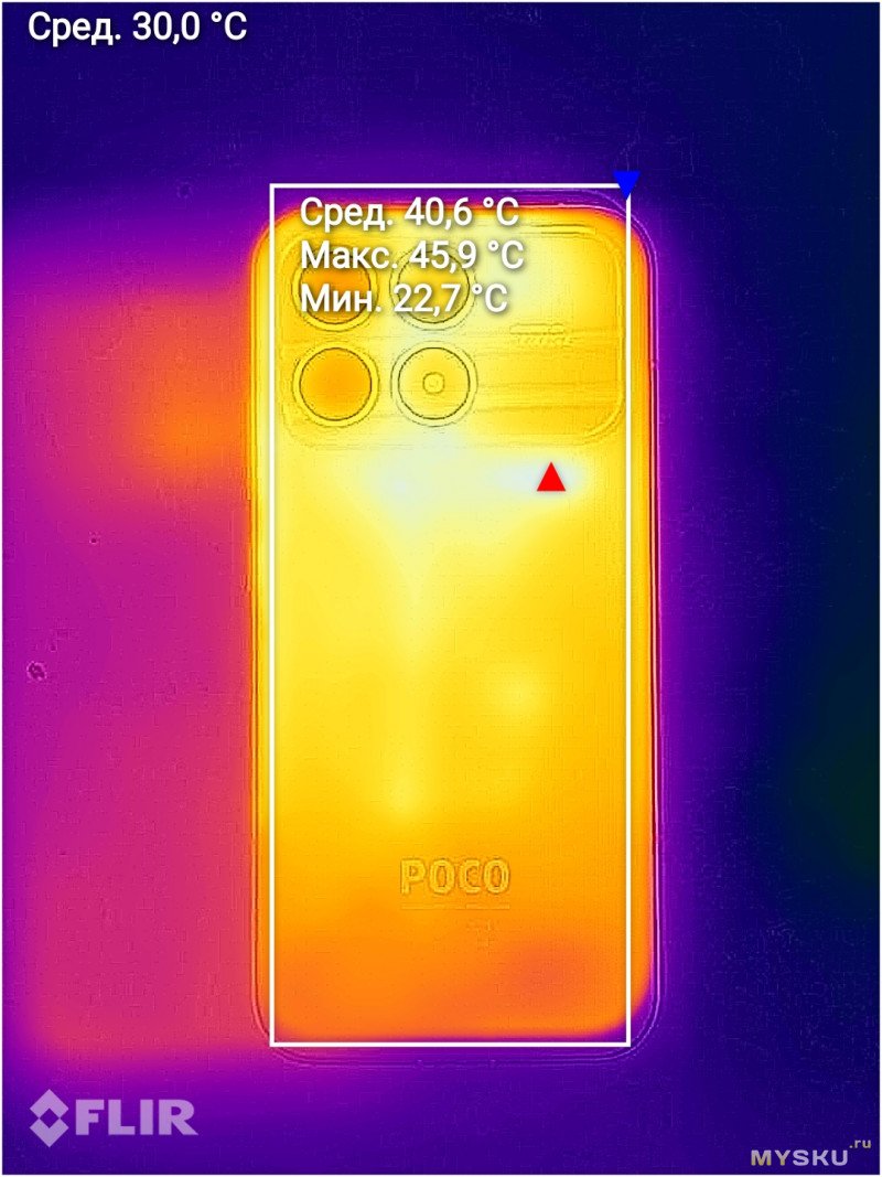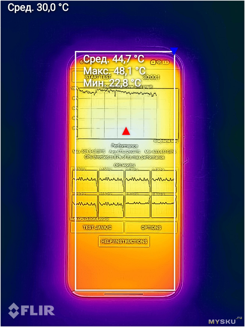 И самое интересное — это результат троттлинг теста на 100 потоках в течение 30 минут. Средний результат POCO F8 Pro — 478326 гипсов, средний результат POCO F7 Ultra — 395395 гипсов. Получается, в плане мощности средний смартфон линейки 2025 г. производительный флагмана 2024 г. Хочется сказать, «чтд», но задачи такой не было. По результатам теста нагрев составил 48⁰С со стороны экрана и 46⁰С с задней стороны.