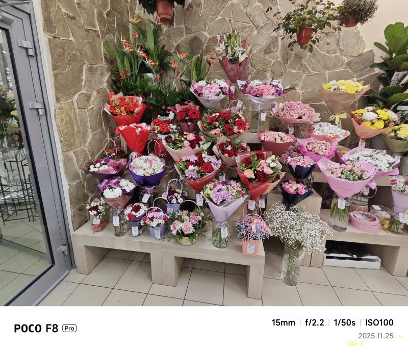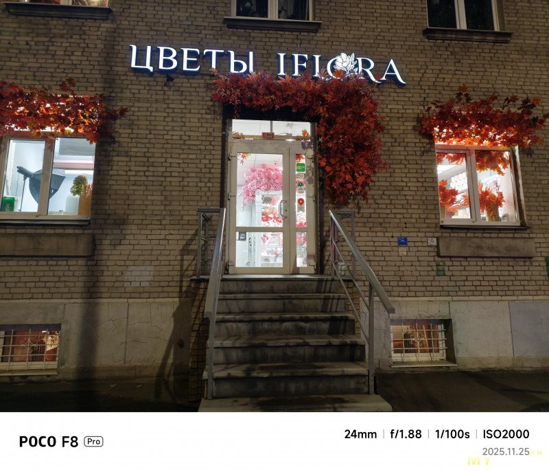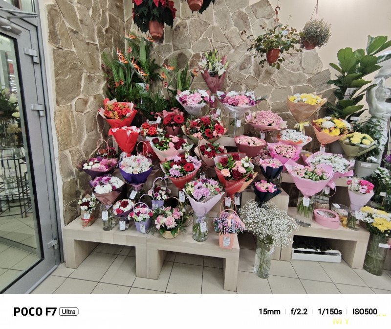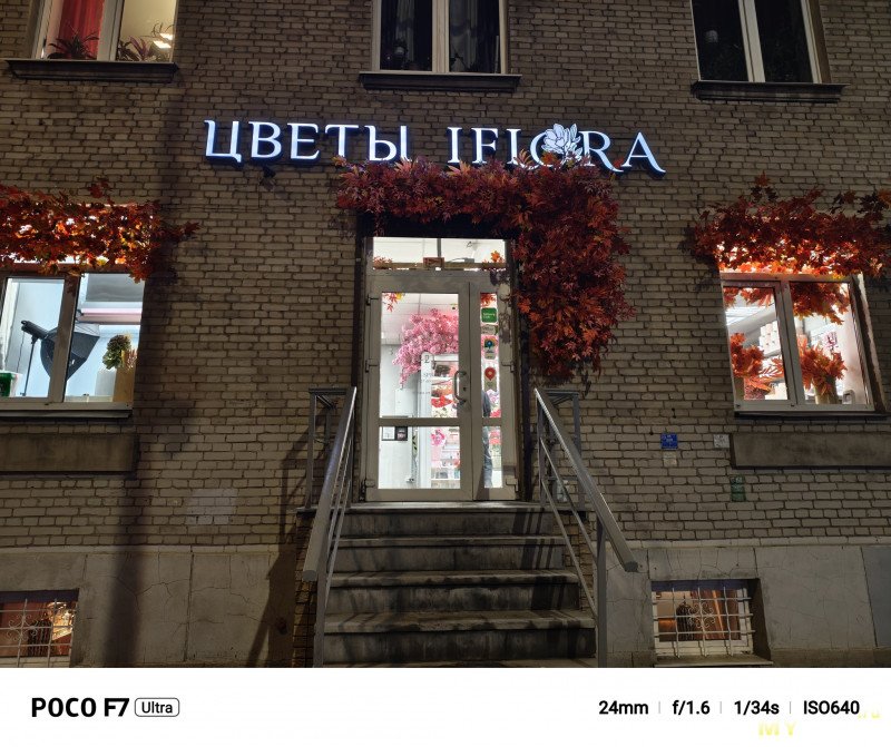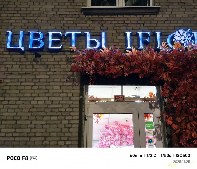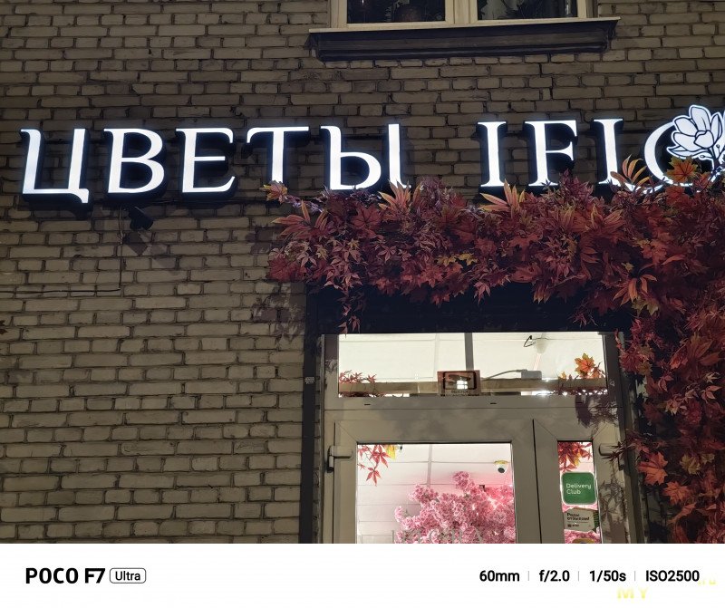 Ещё примеры с надписью магазина цветов на все три камеры. Странно, но основная и телевик увидели на вывеске синий оттенок. Я потом ещё раз перепроверил, есть ли он в действительности. Его не было. Получается, POCO F8 Pro ошибся в кадрах. Это был единственный раз за все тестовые снимки.