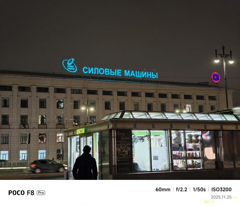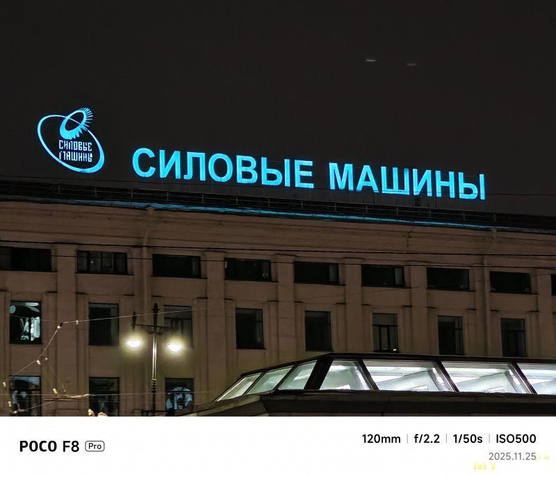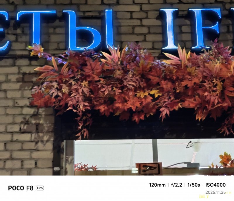 Примеры на телевик 2,5х и зум без потери качества 5х вечером. В данном случае телевик F8 Pro не добавил отсутствующего цвета в вывеску.