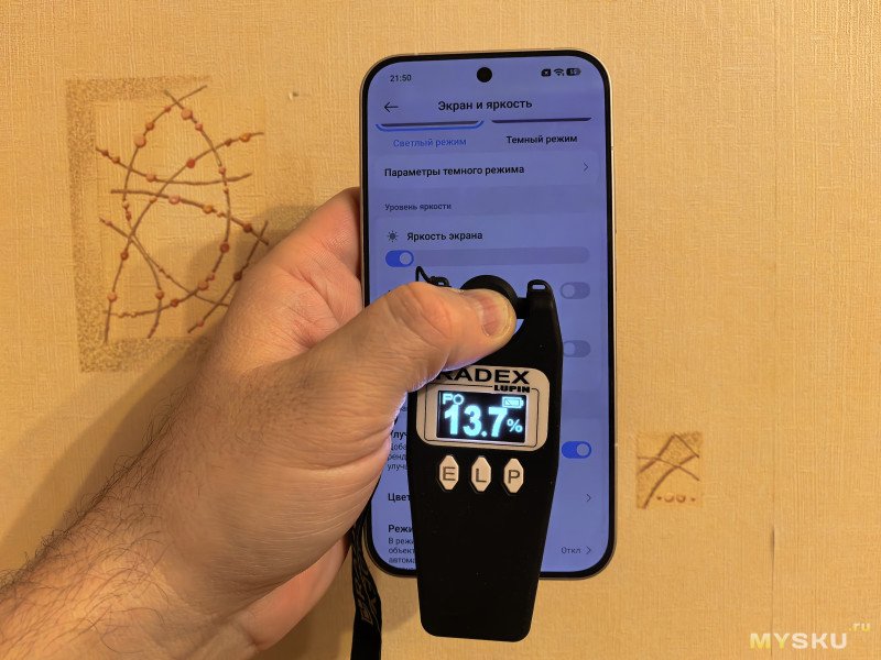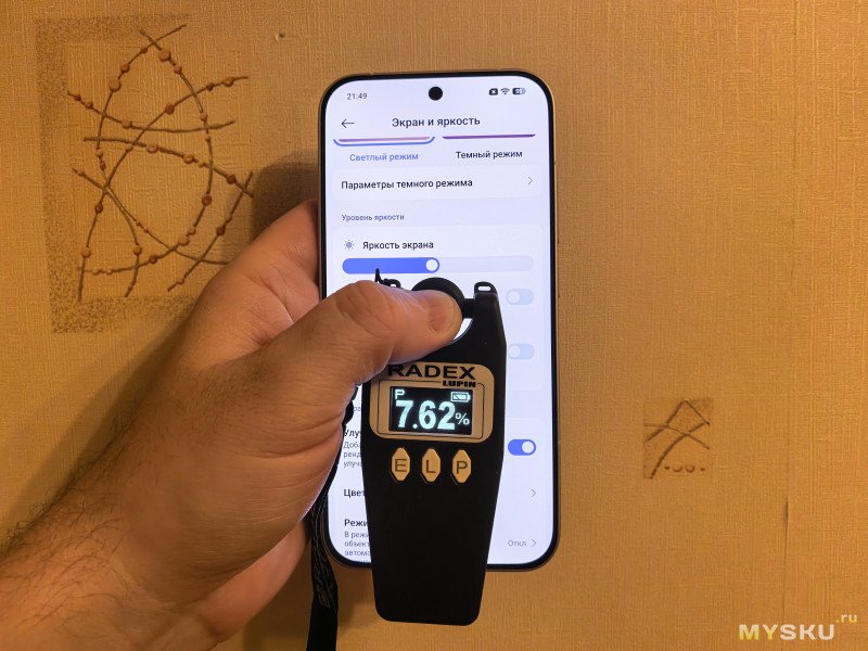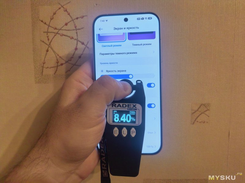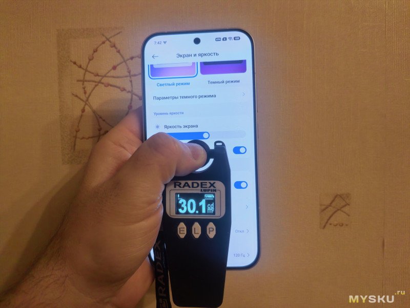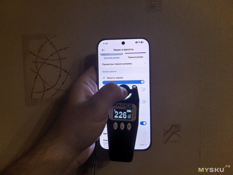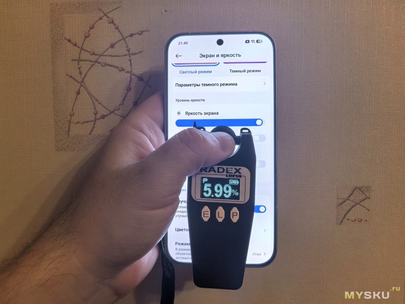 У меня не удалось лучить оценки уровней яркости больше, чем у F7 Ultra. В F8 Pro заявлены большие цифры, а у меня они получились такими же, но они получены не в лабораторных условиях, а далёких от них. Максимальное значение яркости, по Radex Lupin, 226 КД/м² при уровне ШИМ в 6%. В момент оценивания уровень ШИМ был больше, но из-за работы DC dimming его уровень стабилизировался на значениях ниже, которые приведены на фотографиях.