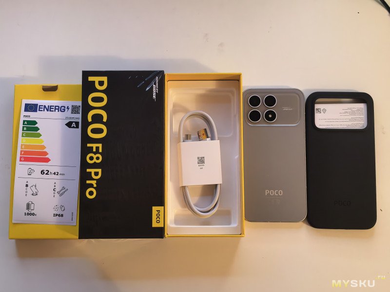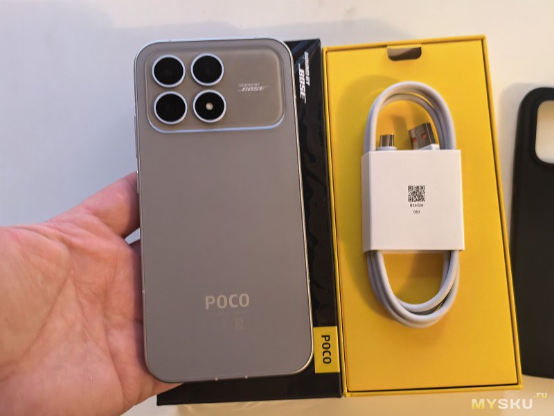 Как много может сказать коробка о комплектации? Ответ: есть ли внутри зарядное устройство. К сожалению, этот вопрос теперь относится к POCO F8 Pro. На кадрах видно, что толщина упаковки уменьшилась, и мы понимаем, что внутри нет ЗУ на 100Вт, с мощностью которых теперь заряжается новинка.