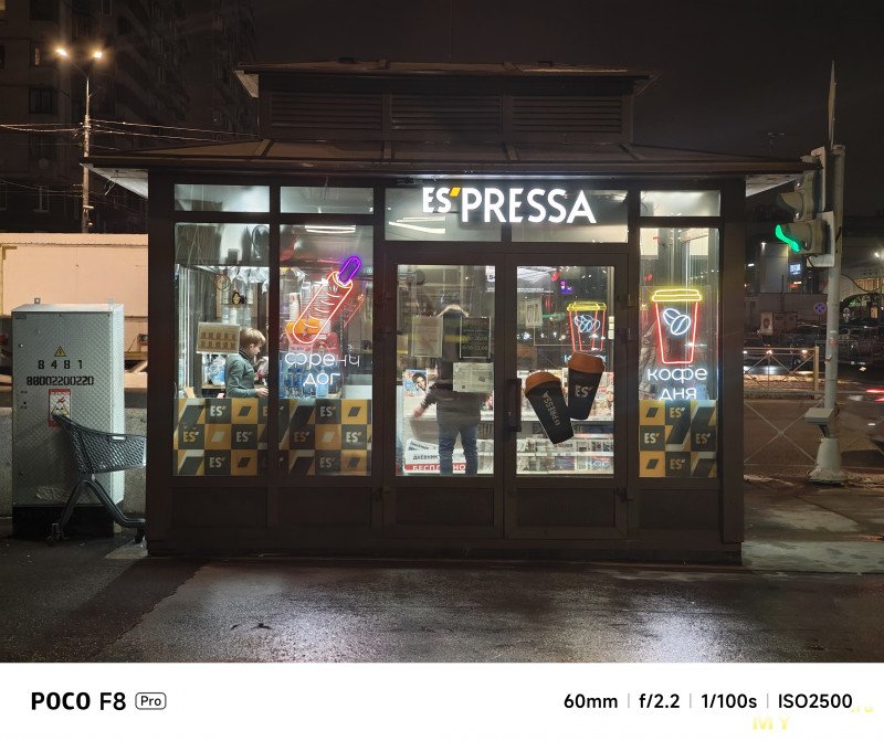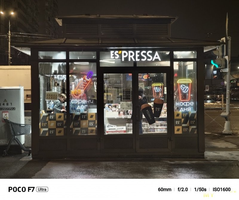 Кадры газетных киосков ниже получились темными, но внутренний мир из не засвечен, можно увидеть, что там происходит. Снаружи — зимний вечер и маленьким матрицам не хватает света для получения немного более яркой картинки. Хорошо, что алгоритмы не вытянули ее.