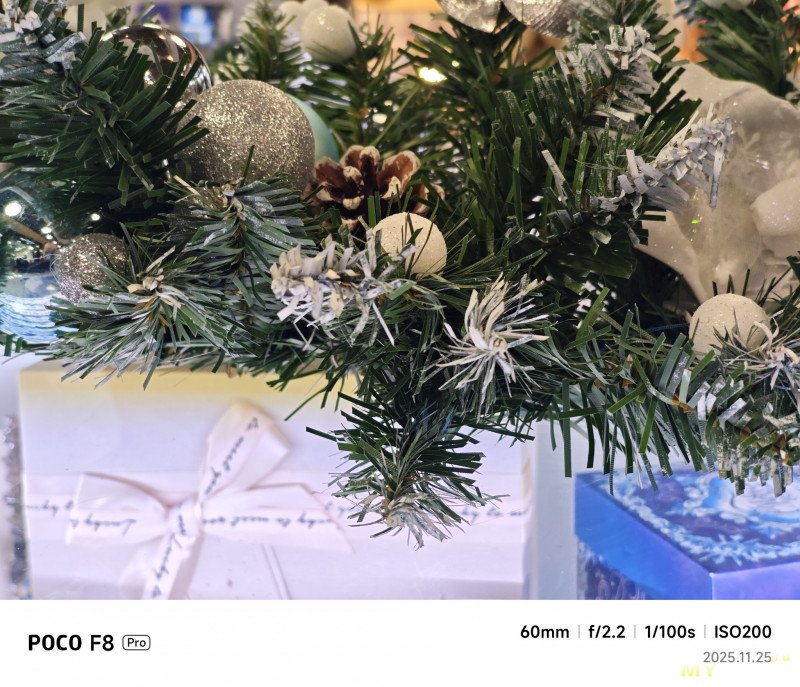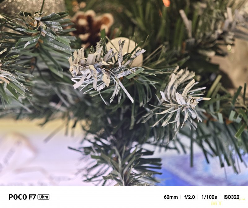 Фотографии на телевик в режиме макро. У двух смартфонов разное расстояние, с которого можно получить макро. У обозреваемого, ожидаемо, ого больше, так как это не флагман линейки. В остальном опять получая разный оттенок жёлтого на два смартфона. Со второй серией кадров часто искусственной ели детализация на F8 Pro неплоха, но ее нет по краям. Четкий кадр только в центре. Учитывая, что фокус достигается с большего расстояния, в кадр попадает больше информации без фокуса.