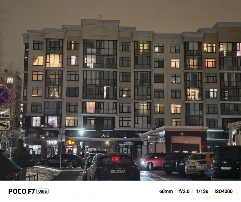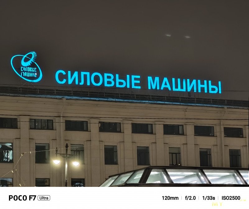 Еще примеры, но уже на основную и телевик по отдаленным объектам вечером. Холодный оттенок дома на обозреваемый выглядит предпочтительнее, так как теплый у F7 Ultra сливает здание с окружением. При увеличении видно снижение детализации на обоих.