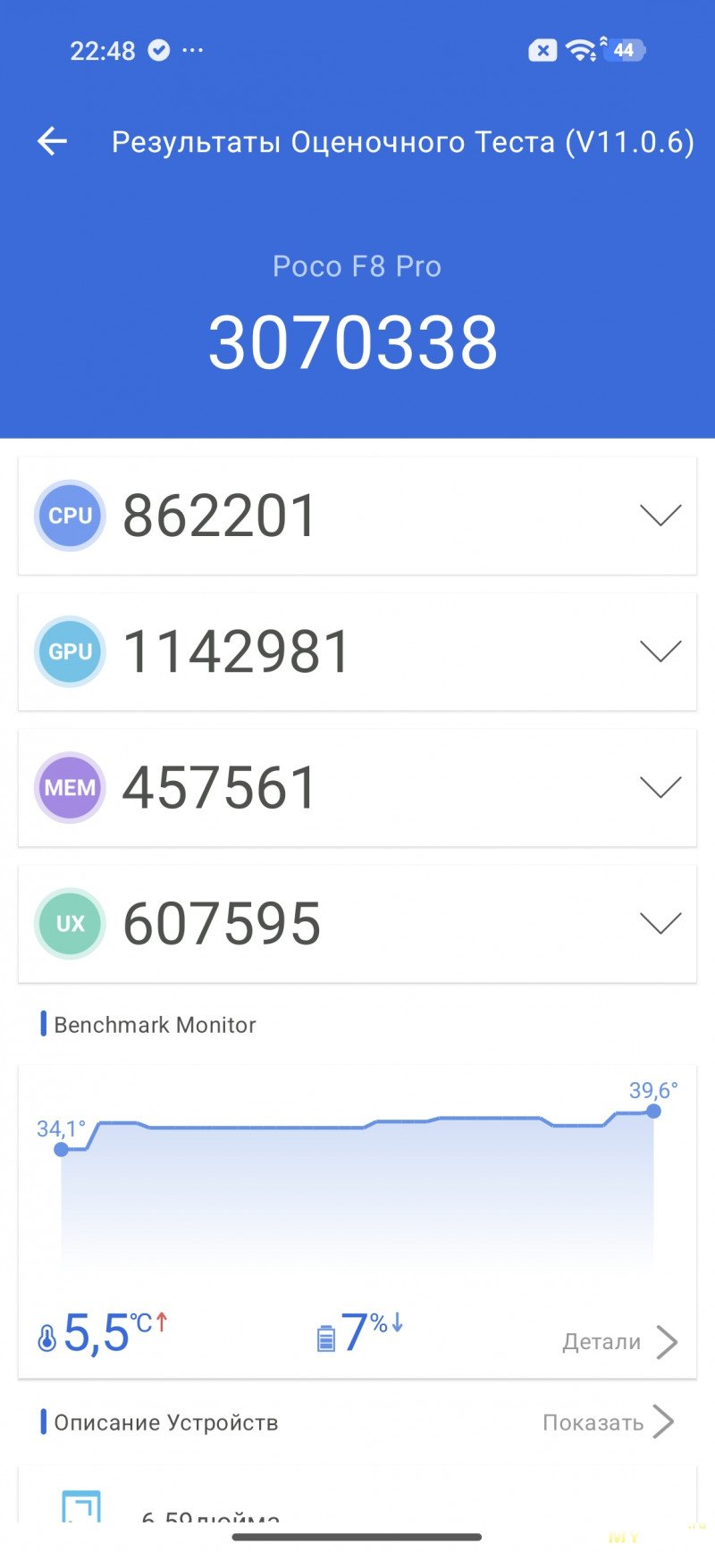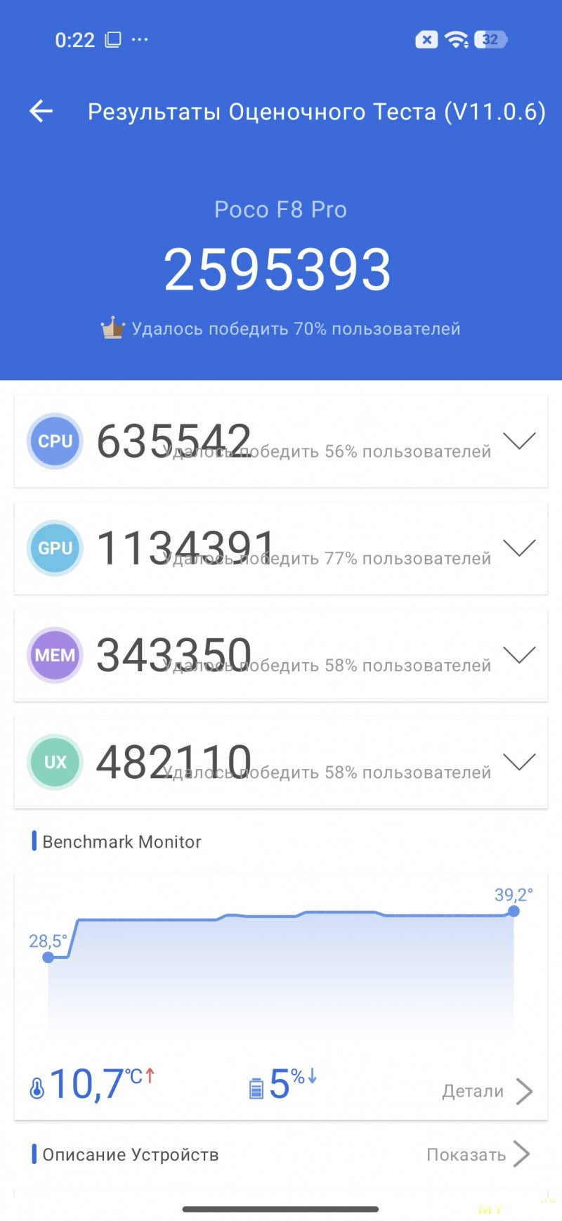 По результатам проведенных тестов Я остался доволен. С POCO F7 Ultra у меня еле получилось набрать 3 млн. баллов, но с обозреваемый это было немного проще. На левом скриншоте показал результат тестирования на балконе, справа — в комнате. На маркетинговых страницах говорится о 3,2 млн. баллов в Натуру, но у меня получилось только 3,1 млн. баллов в Antutu V11.