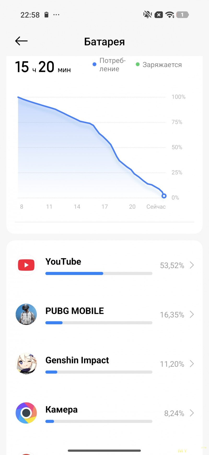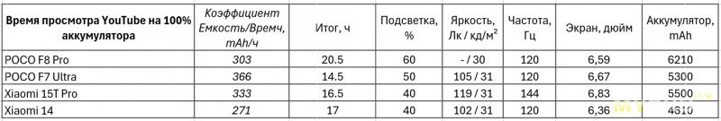 На скриншоте использования POCO F8 Pro за день цифры другие, но это вопросы к отображению данных в системе смартфона. У меня получилось, что полный разряд длился 13 ч, за которые проводились тесты, просматривалось видео на YouTube, устанавливались игры и была непосредственно игра в них. Из второй таблицы выше видно, что коэффициент времени разряда и ёмкости аккумулятора у обозреваемого не самый лучший, но по автономности то минимум на 50% лучше, чем другие смартфоны.