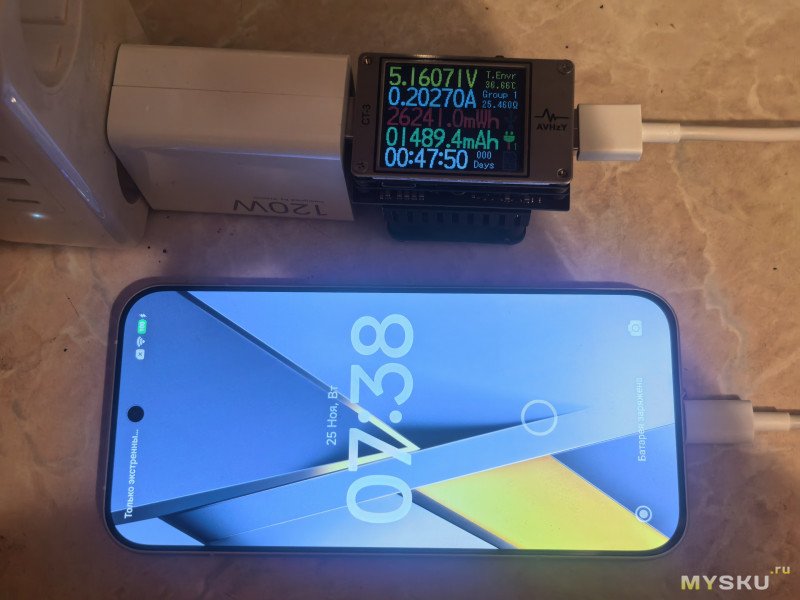 Через USB-C USB-C и 140Вт ЗУ Aohi MagCube, поддерживающее UFCS 63Вт, стандарт быстрой зарядки от брендов HUAWEI, Xiaomi, Vivo, Oppo, заряд начинается с 5В из выключенного состояния, что мне показалось очень медленным, поэтому тест остановил и заменил его на 67Вт ЗУ бренда. Во второй раз не включил режим «Ускорение» и получил, ожидаемо, меньшую скорость, но это не означает, что 67Вт ЗУ восполняет ёмкость медленнее. В итоге потратилось 55 мин на восстановление 1518mAh (26,2Wh).
