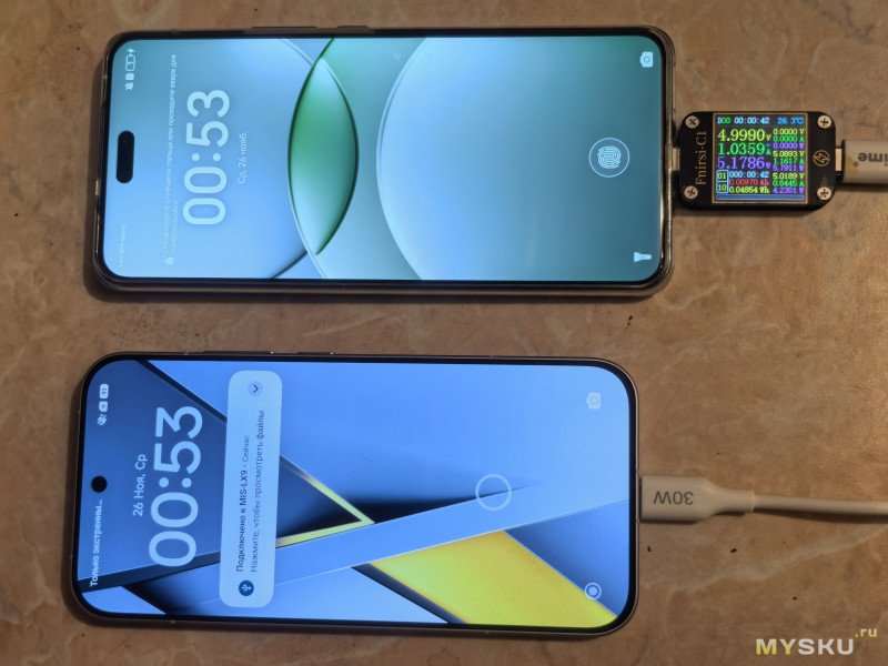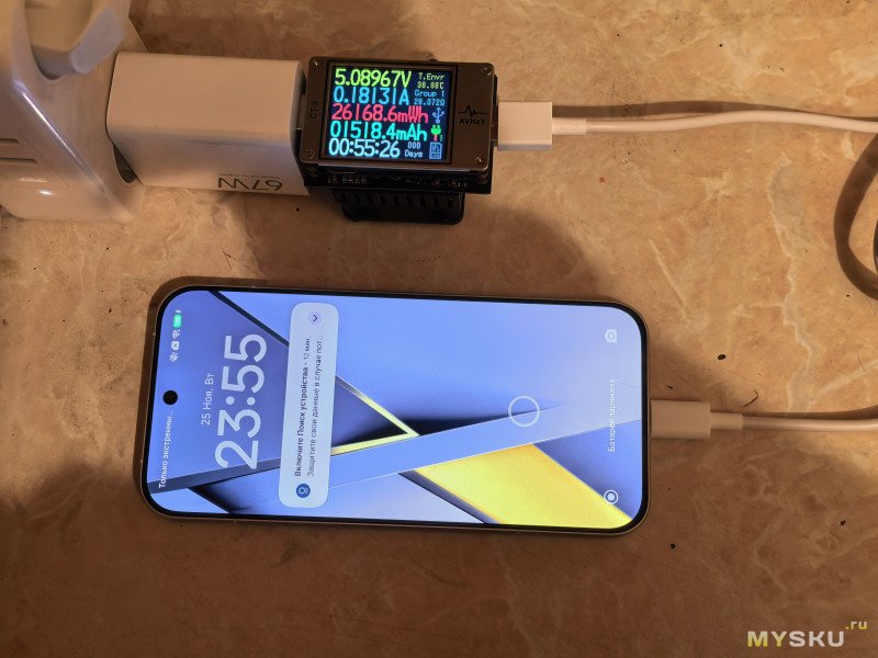 В характеристиках значится, что есть 22,5Вт разряд от смартфона. Мне не удалось получить заявленную мощность. Взял специально смартфон HUAWEI Nova 13 Pro (обзор здесь), но мало того, что из выключенного состояния он заряжался очень долго с параметрами 5В/0,5А, так и после единократного включения было 5В/1А. Включить из разряженного состояния его у меня не получилось. Мощность разряда POCO F8 Pro не превысила 5Вт. Подобная ситуация была с POCO M7 (обзор здесь) и POCO C85 (обзор здесь). Не удалось из двух названых достать заявленную мощность разряда в 18Вт.