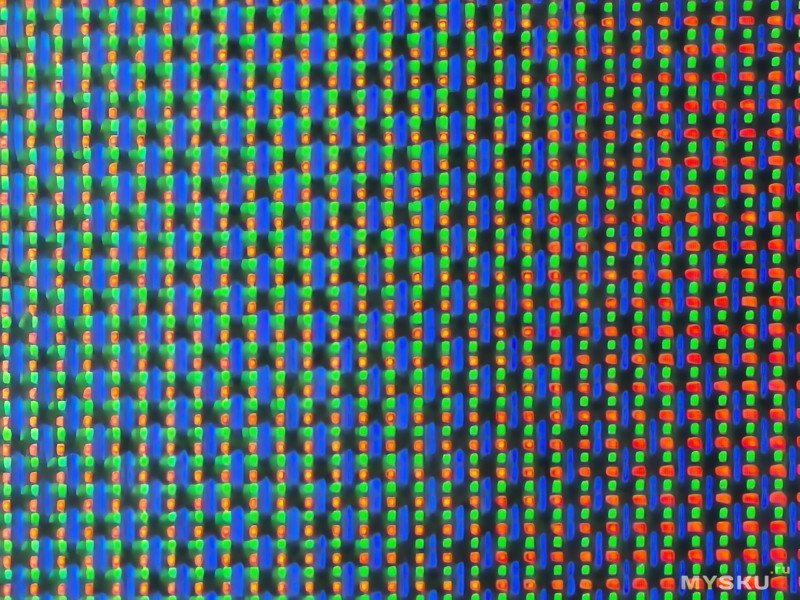 Субпиксельная структура HyperRGB AMOLED отличается от привычной. По заявлению производителя, эквивалентное разрешение составляет 1,0, а не 0,8 как у обычных OLED-панелей. На макро фотографии ниже в 40х видно, что структура пикселей другая. Синий субпиксель прямоугольный, а зелёный и красный квадратные. Дополнительно к дисплейный панели М10 в смартфоне сделана из светящегося красного материала, что повышает светоотдачу на 11,4%.