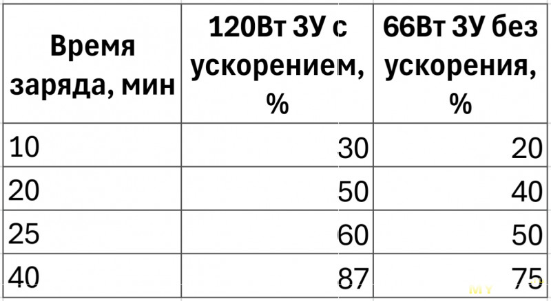 Сравнение скорости заряда с включенным режимом «Ускорение» и 120Вт ЗУ т без этого режима, го с 67Вт ЗУ свел в таблицу ниже. Разница в 30% получается только на десятой минуте. В остальных концах интервалов ниже она меньше 30%. Интересно получается, что заявлена поддержка 100Вт, но процесс с меньшей по мощности зарядкой идет немедленнее, чем с большей по мощности. Я такое получаю не в первый раз, го каждый раз удивляюсь результату.