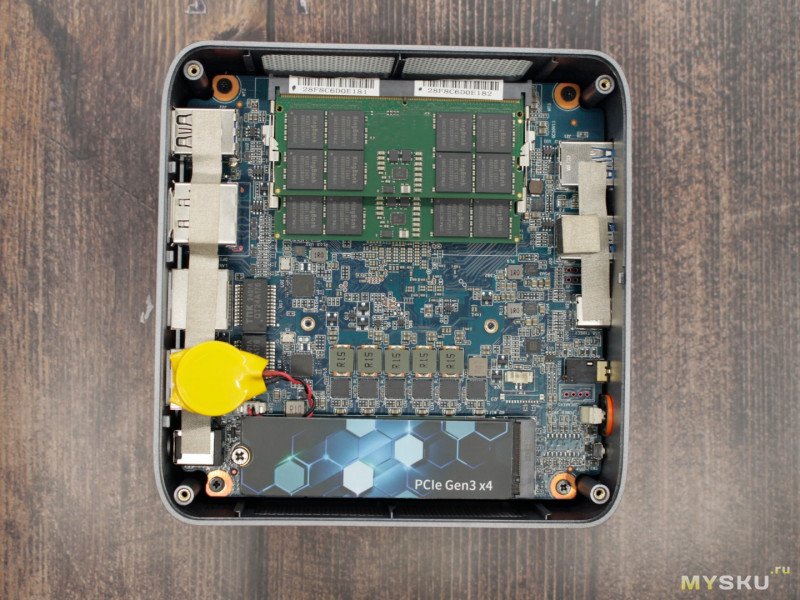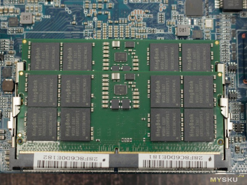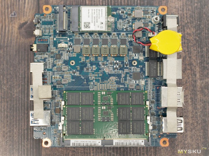 На материнской плате выделяется батарейка BIOS в яркой жёлтой термоусадке и она подключена через съёмный кабель. В нижней части платы расположены два модуля оперативной памяти производства KingBank, а также накопитель без маркировки производителя.