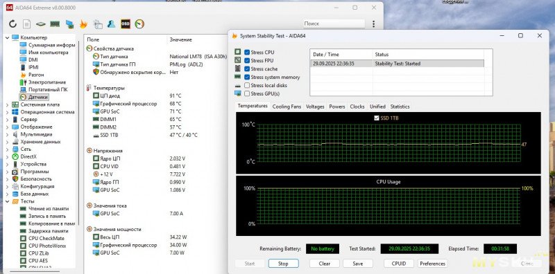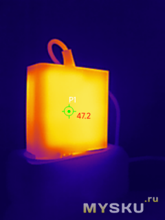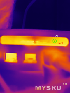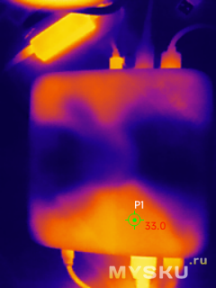 БП, по замерам, в пике потребляет до 87 Вт и не нагревается, по ощущениям — просто теплый. Термография подтверждает ощущения.