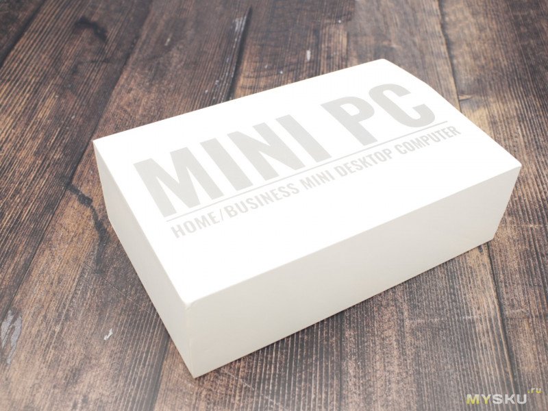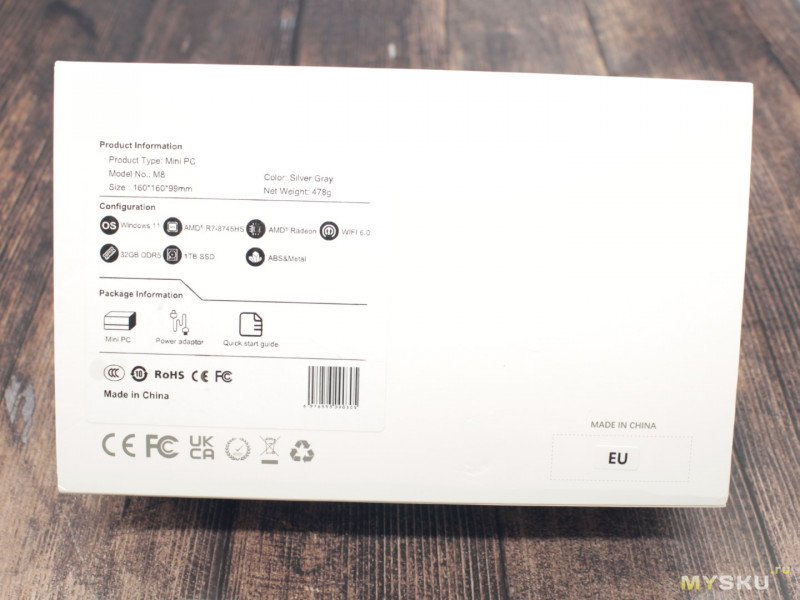 Ninkear M8 приходит в простой коробке с суперобложкой: белая основа, серая надпись «Mini PC». На обороте — наклейка с характеристиками.