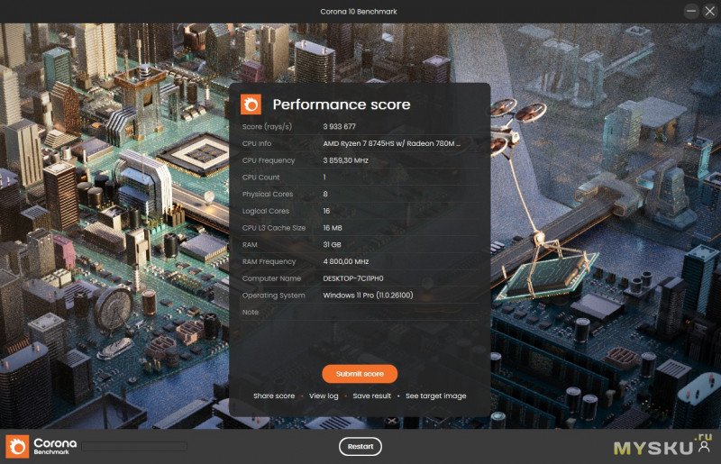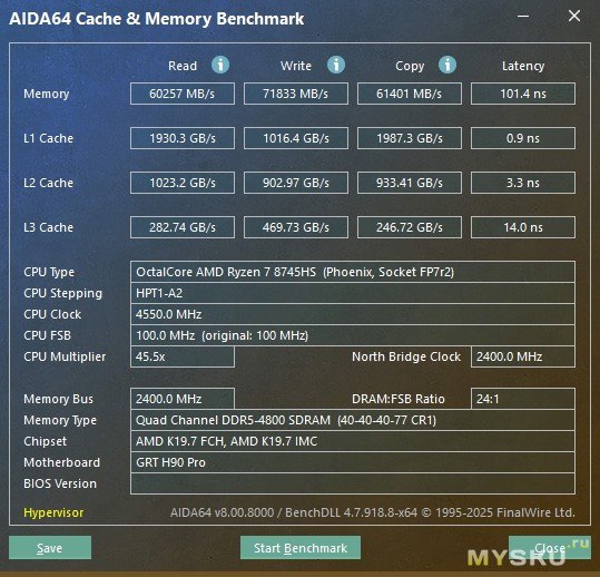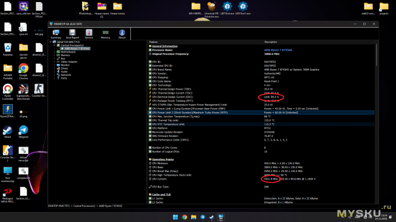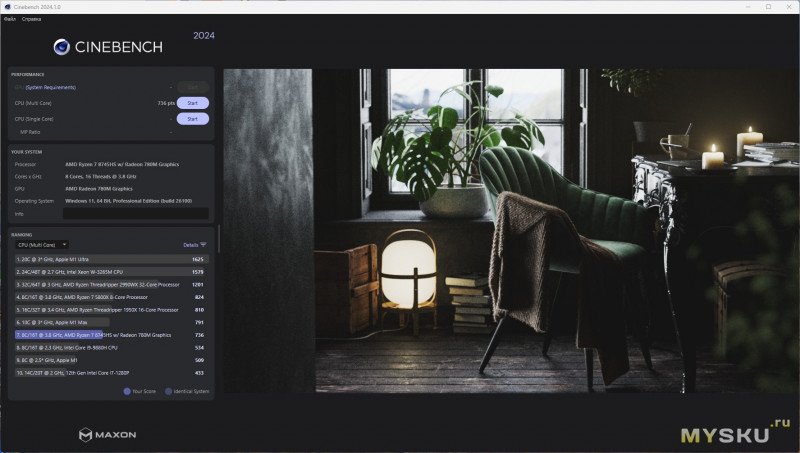 Эффективная производительность AMD Ryzen 7 8745HS лимитирована TDP, что ограничивает частоты. ЦП нагревается до 90-91С под мах нагрузкой, что адекватно для “мобильного” железа.