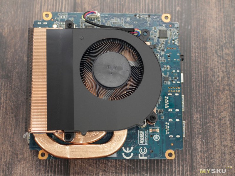 Верхняя часть материнской платы Ninkear M8 выделяется крупным медным радиатором с двумя теплотрубками; для принудительной циркуляции воздуха через радиатор используется вентилятор турбинного типа.