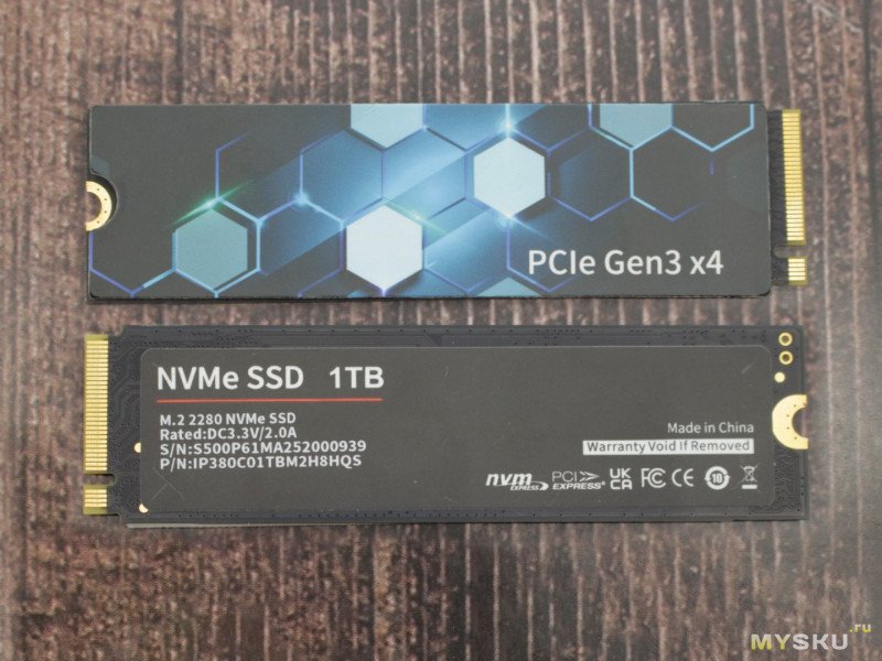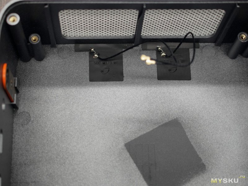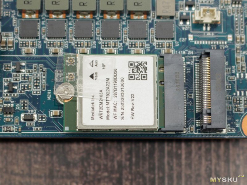 SSD‑накопитель с двумя наклейками, причём одна из них металлизированная и помогает эффективному рассеиванию тепла. Под накопителем расположен Wi‑Fi‑модуль от MediaTek (MTK), а разъёмы для антенн скрыты за пластиковой накладкой.