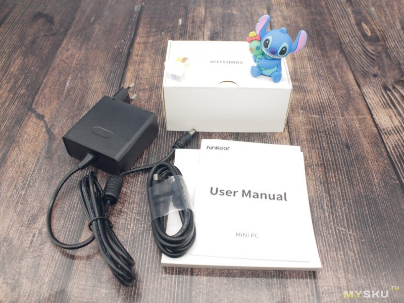 Рядом с самим ПК — коробочка с аксессуарами, под ним — конверт с мануалом.