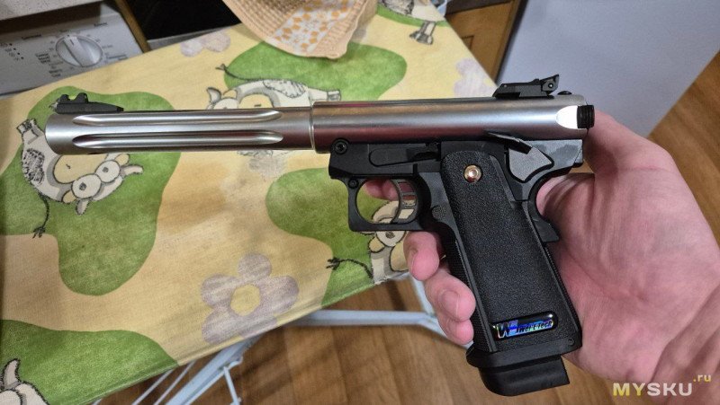 В руке лежит просто отлично, за счет эргономики самой рукоятки, основанной на элитном классе спортивных пистолетов для практической стрельбы: STI и SVI Infinity. Прицельные просто идеальные, именно такие и должны быть.