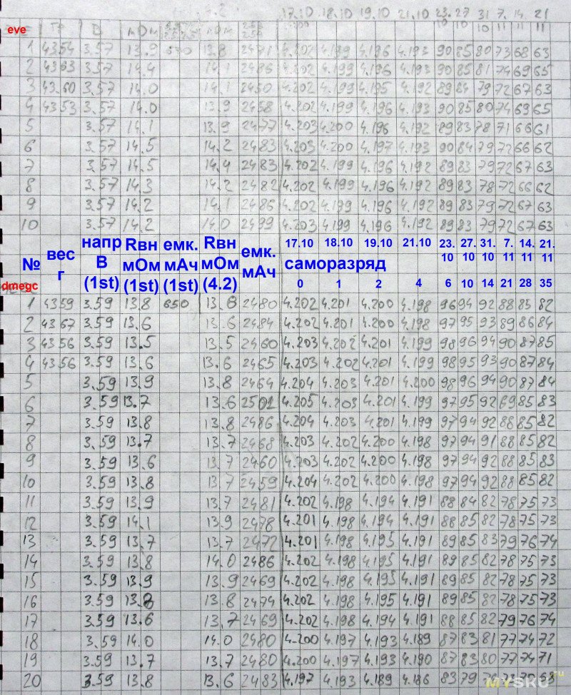 По графику видно, что на длинной дистанции eve по нагреву разгоняются немного быстрее, чем dmegc. Еще из интересного — под конец разряда рост температуры ускорялся, притом что разряд производился постоянным током, а не мощностью, и это заметно даже при токе в 2.5А.Сводная табличка, включая ~месячную выдержку на предмет саморазряда (у прошлых eve, видимо не зря дебрендированных, с этим были проблемы) — получилось немного странно, как будто ровно у половины dmegc (взятых и пронумерованных последовательно из коробки) отличается от второй половины, хотя серийники у них перемешаны.