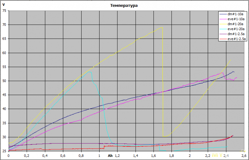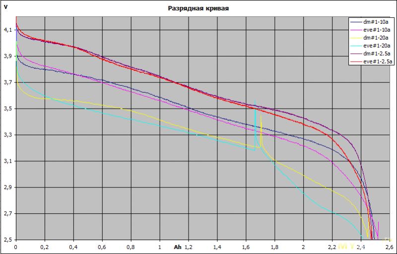 По графику видно, что на длинной дистанции eve по нагреву разгоняются немного быстрее, чем dmegc. Еще из интересного — под конец разряда рост температуры ускорялся, притом что разряд производился постоянным током, а не мощностью, и это заметно даже при токе в 2.5А.