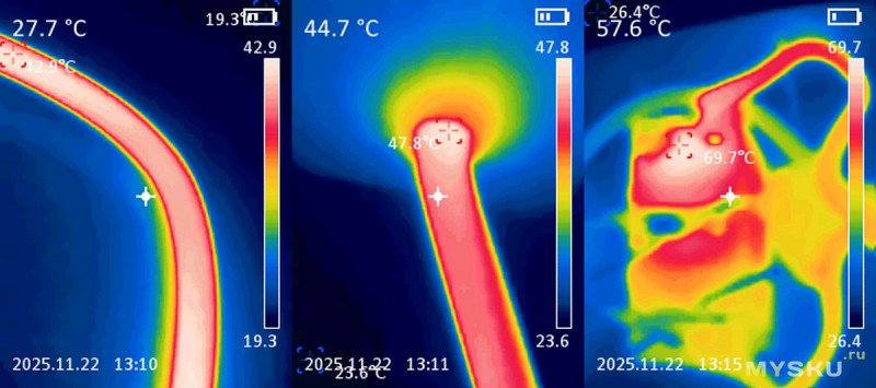 Температура внешней оболочки проводов составила 43°C, у точки входа корпус 48°, температура выключателя 70°. Существенный нагрев вилки и контактов блока розеток не зафиксирован.