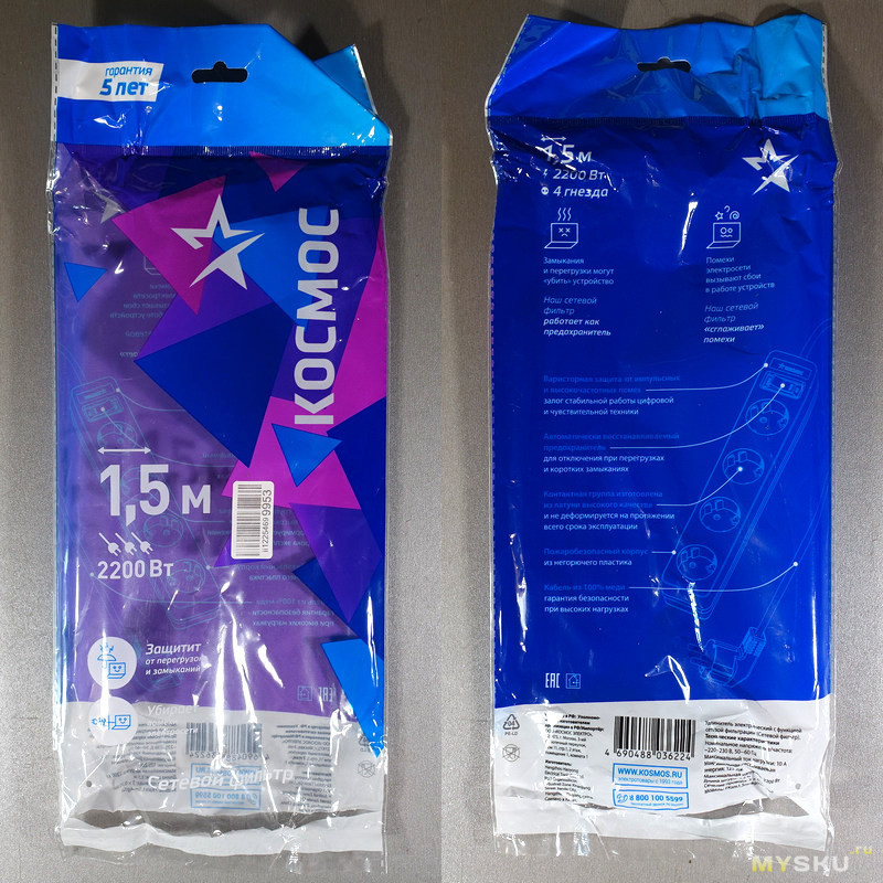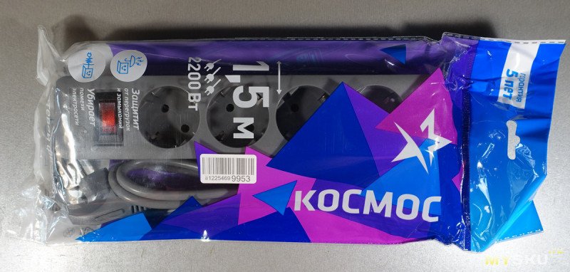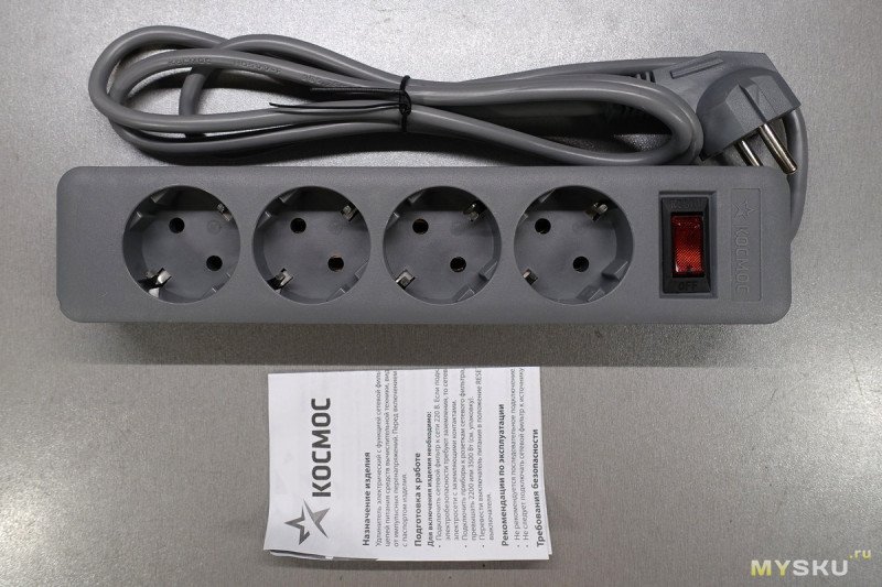 Везде есть маркировка «Космос» — на пластике блока розеток, на вилке, на проводе. Установлен термовыключатель, автоматически отключающий нагрузку при превышении допустимого тока. Выключатель разрывает только один провод.